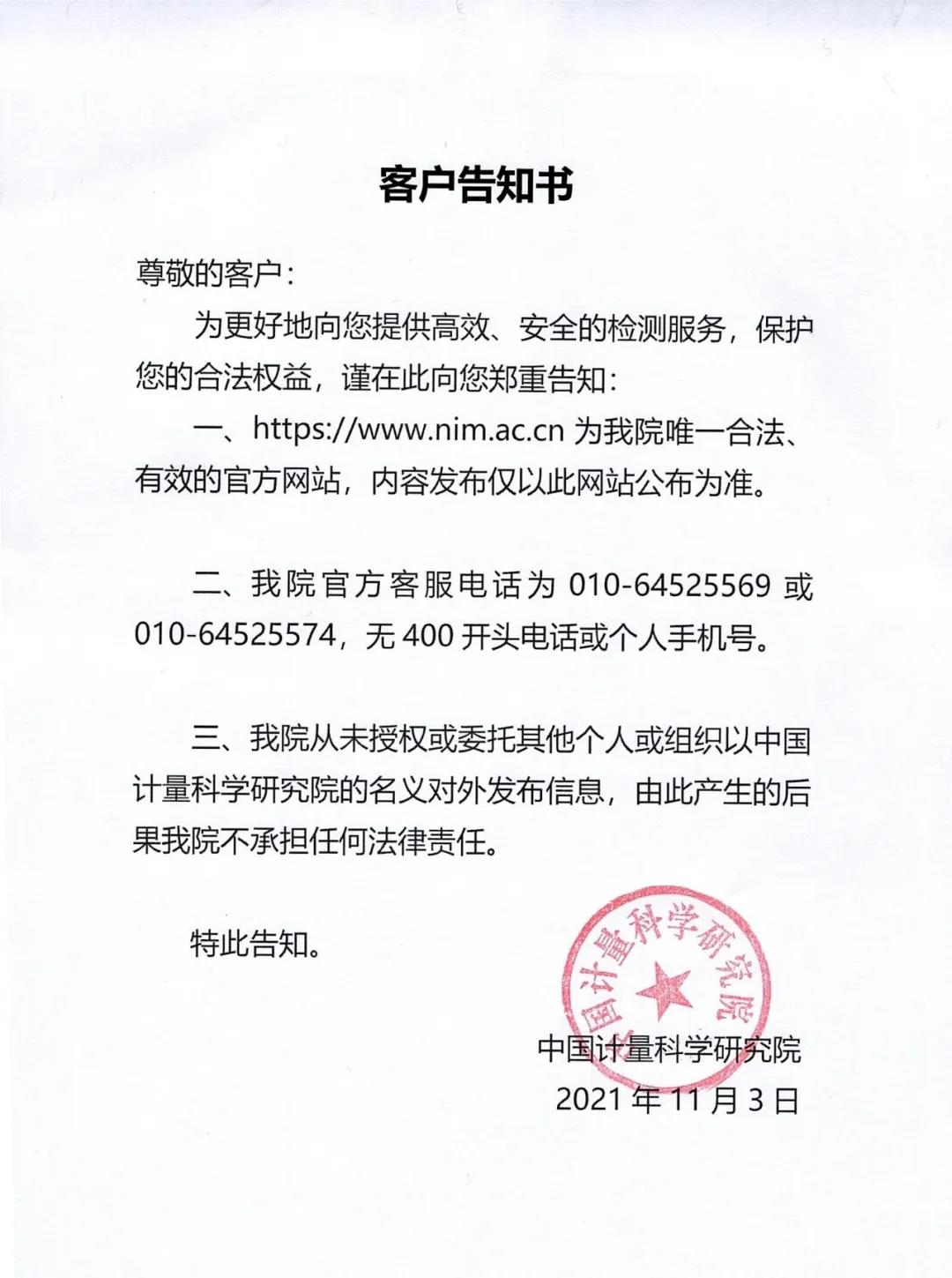 中國計量科學(xué)研究院發(fā)布客戶告知書